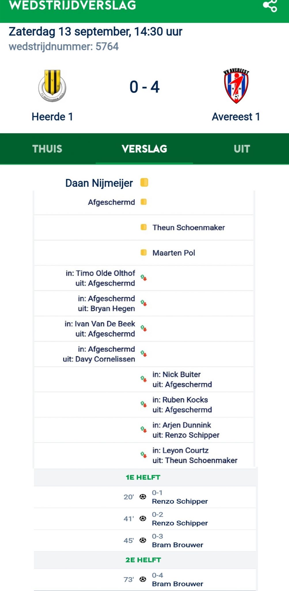 Avereest is slagvaardiger via opnieuw Brouwer, na slordig uitverdedigen van Heerde kant (0-4). De wedstrijd, kortstondig gestaakt door onweer, kabbelt voort en in de eindstand komt geen verandering.